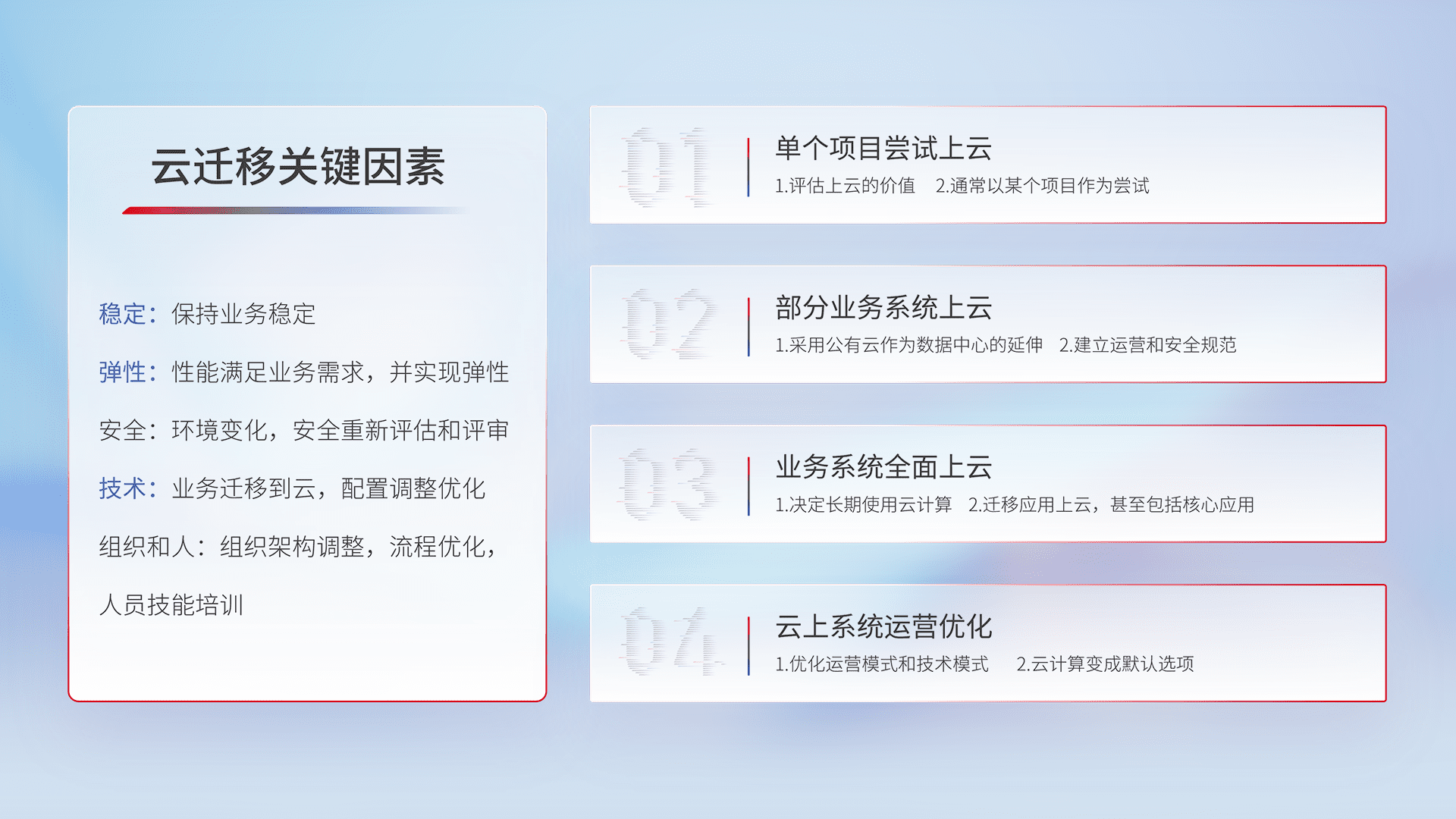 结合实际业务,,从规划设计、、、云平台选型、、、、云原生改造、、数据迁移、、、集成交付,,迁移全过程为客户识别最佳上云路径,,,做好风险识别管理,,设计网络架构、、、身份权限、、安全审计合规、、、操作审计、、日志审计、、监控告警策略、、、、多站点容灾设计等,,,对云上基础设施进行整体规划,,,提升IT治理水平,,,以满足弹性、、、高可用、、、、高性能的需求。。。。