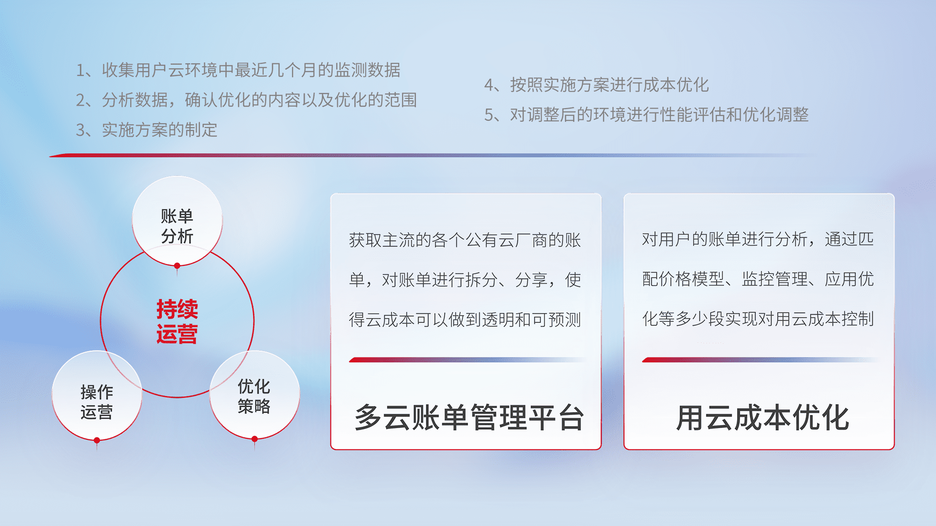 通过多云纳管,,,,以统一的资源数据模型把客户的云资源进行抽象和封装,,进而实现对多云资源的统一操作,,,保障云资源管理的可靠性、、、、稳定性与可用性。。。量身定制化运维内容,,,配置、、、开发运维、、、、补丁管理、、备份、、监控、、、、认证和访问管理、、、、审计和日常巡检等,,保障在用云过程中的可靠度,,,,稳定度以及高可用率。。。