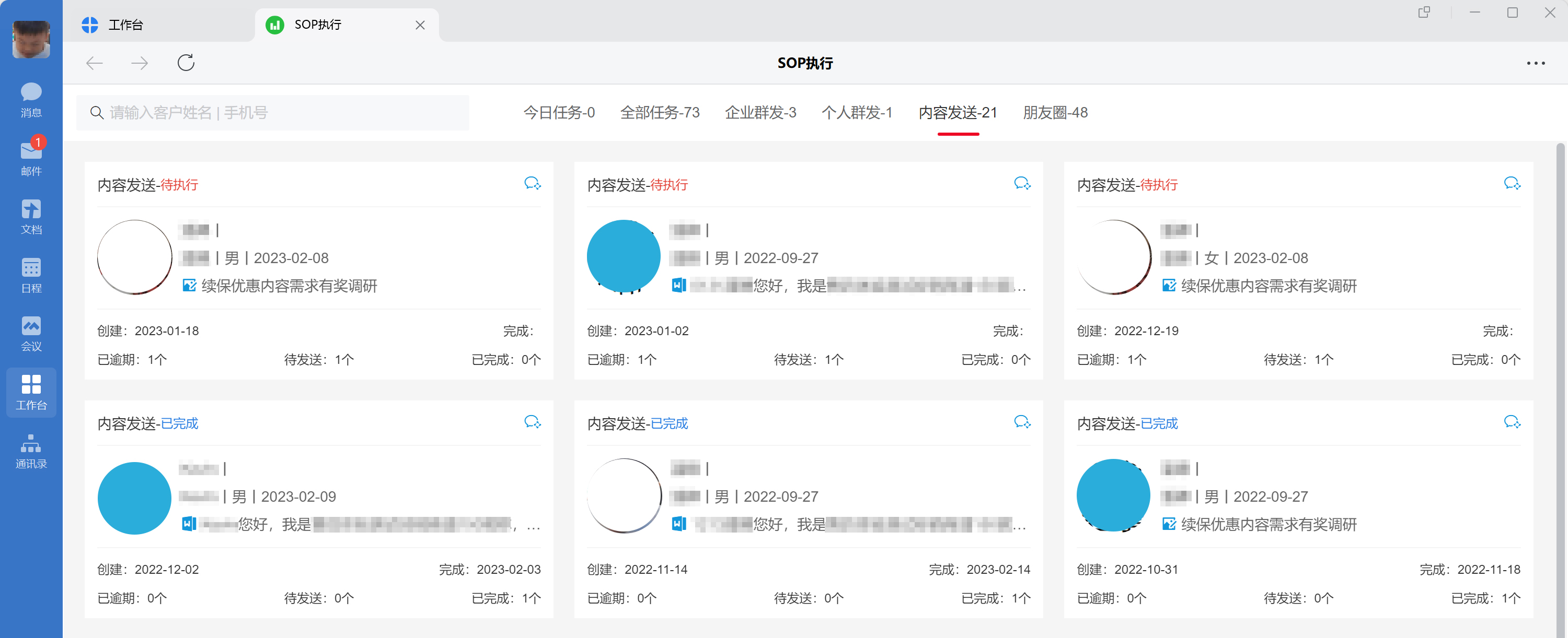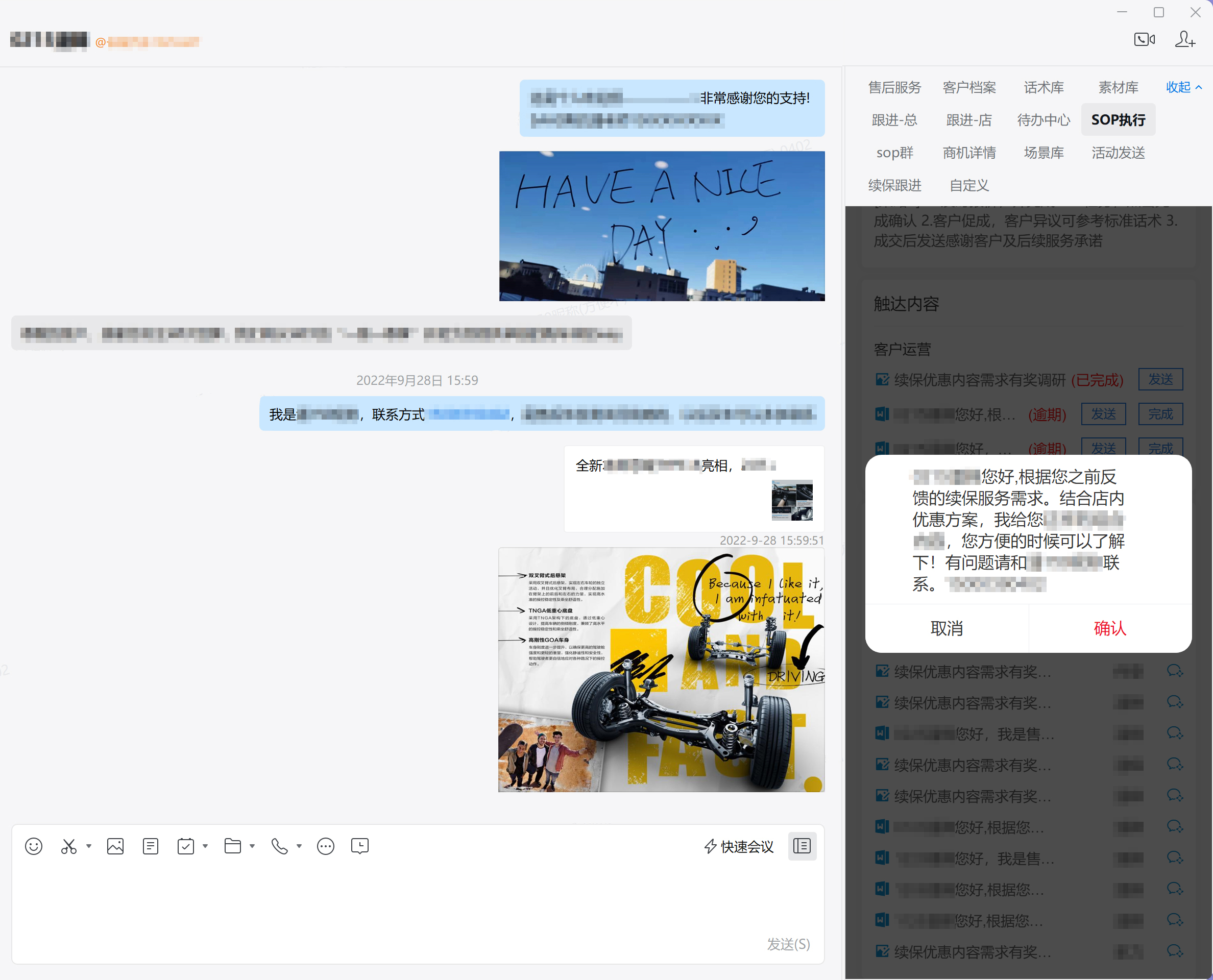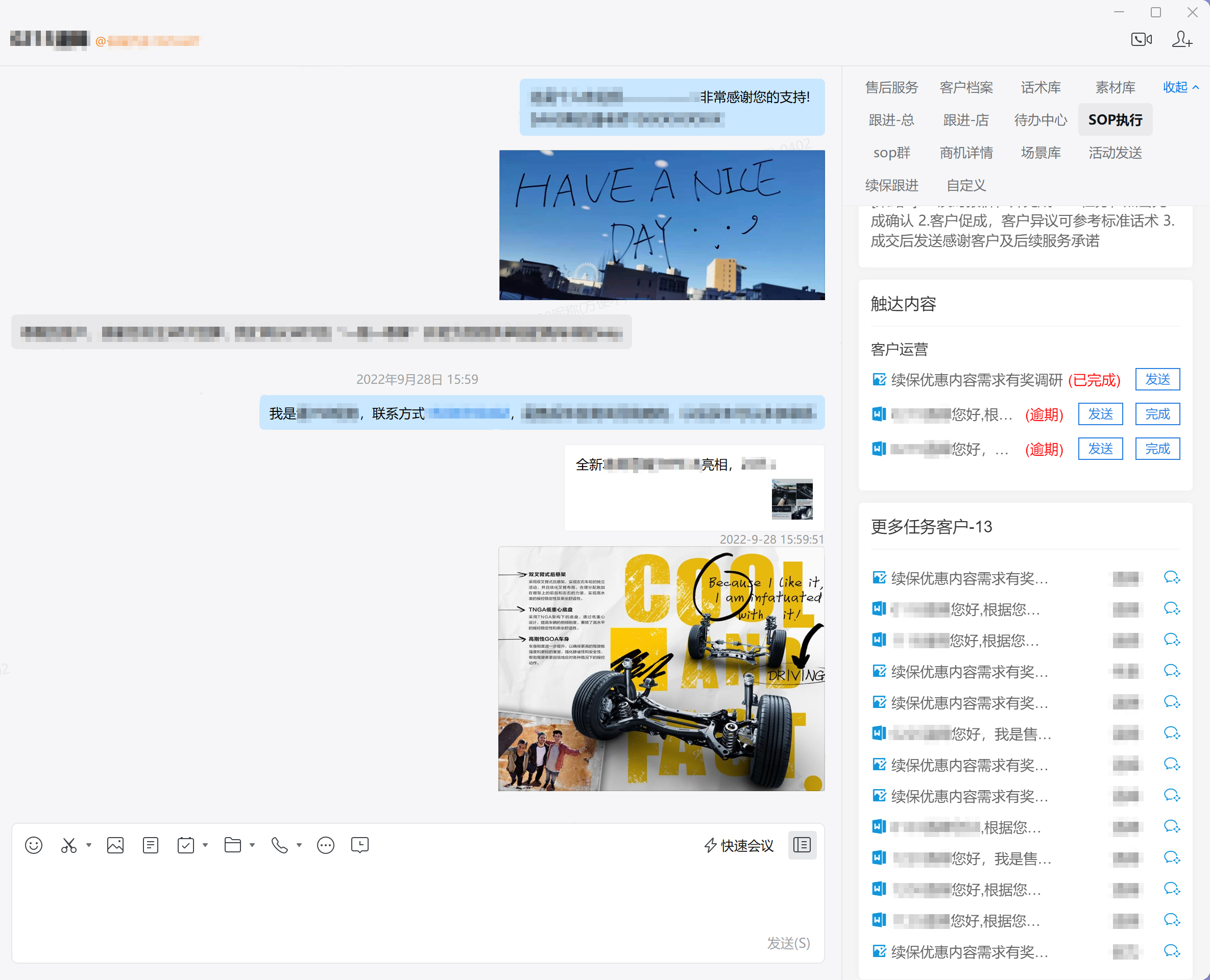 基于自研的企微SaaS系统,,,形成标准化的客户跟进机制。。续保专员根据智能的SOP,,可以更高效地管理客户,,,,并通过规范、、、、统一的内容精准触达客户,,提升客户满意度。。。