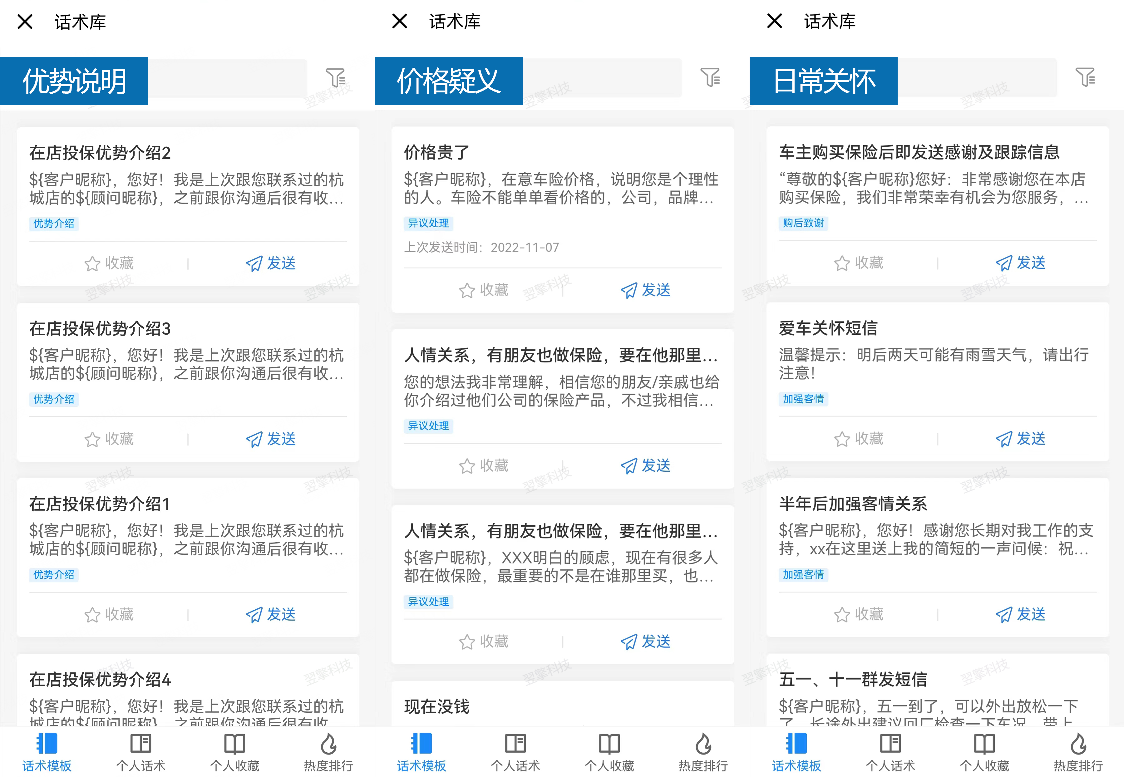 尊龙时凯专家提供话术指导,,在系统中建立话术库和素材库。。。续保专员可根据关键词选择合适的内容,,,快速发送客户。。。。通过规范化的客户触达机制,,,提升跟进工作效率。。。。